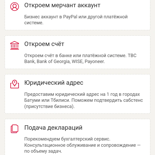 Они обладают глубокими знаниями в области законодательства Грузии и всегда были готовы ответить на все наши вопросы и устранить любые сомнения. Они провели нас через все необходимые шаги и формальности, что сделало процесс регистрации гораздо более понятным и удобным для нас.